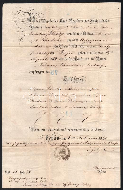 1851 Berlin, igazolás keresztelésről, pecséttel, hajtott.