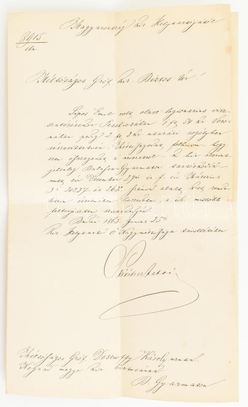 1863 Gróf Desewffy Károlynak, Nógrád megye kir. biztosának címzett lev...