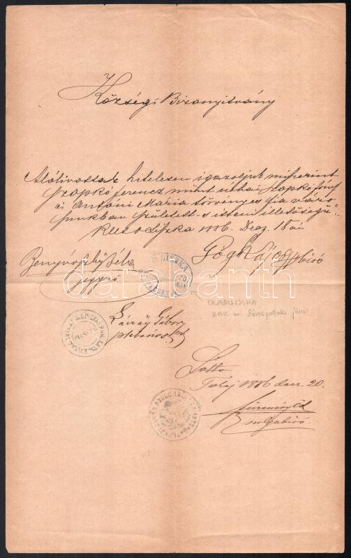 https://www.darabanth.com/en/444-Online-auction/444.0/Art-and-other-collectibles/Documents~500022/1886-Olaszliszka-kozsegi-bizonyitvany-pecsetekkel-alairasokkal~II2928229