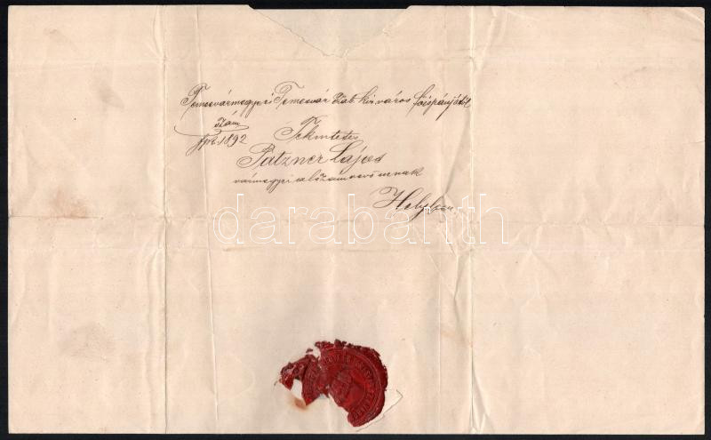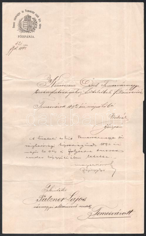 1892 Temesvár, Temes vármegye és Temesvár szab. kir. város főispánja á... https://www.darabanth.com/en/444-Online-auction/444.0/Art-and-other-collectibles/Documents~500022/1892-Temesvar-Temes-varmegye-es-Temesvar-szab-kir-varos-foispanja-altal-kiallitott-fos~II2931153