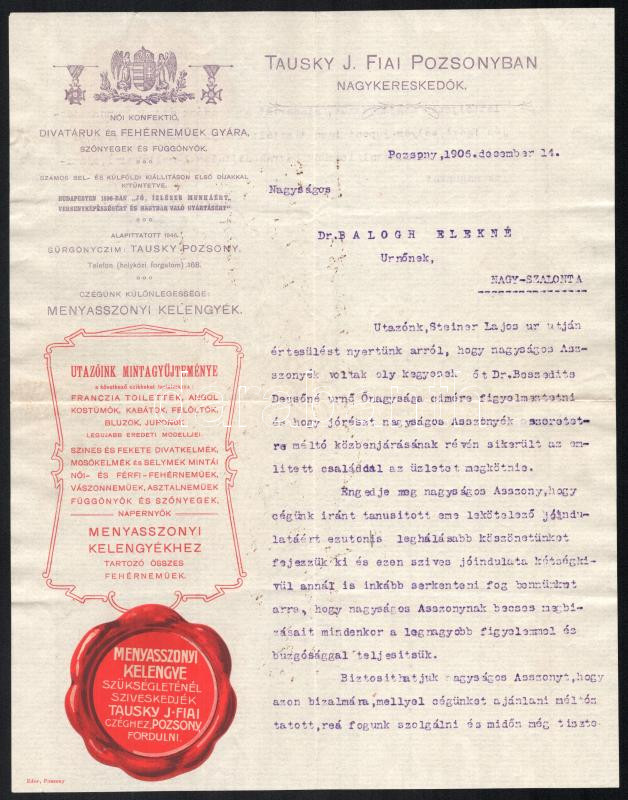 1906 Pozsonyi női konfekciónagykereskedő (Tausky J. Fiai) fejléces lev...