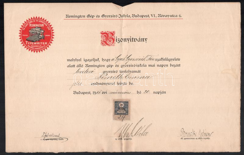 1908 Bp., Remington Gép- és Gyorsíró-Iskola által kiállított bizonyítvány gyorsíró tanfolyam elvégzéséről, aláírásokkal, 30f okmánybélyeggel, középen hajtott, 35,5x22,5 cm