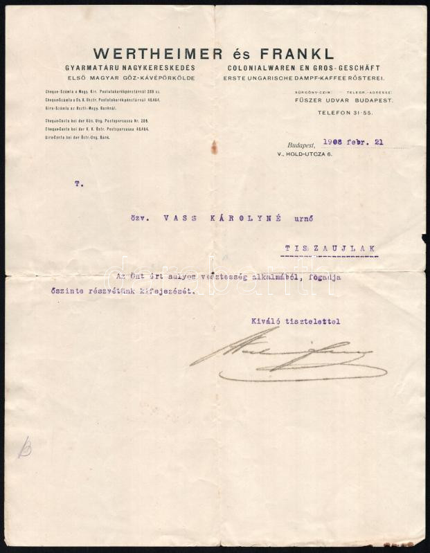 1908 Bp., Wertheimer és Frankl gyarmatáru nagykereskedés fejléces levélpapírra írt részvétnyilvánító levele