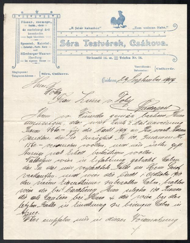 1909 Csákova, Séra Testvérek fejléces üzleti levele