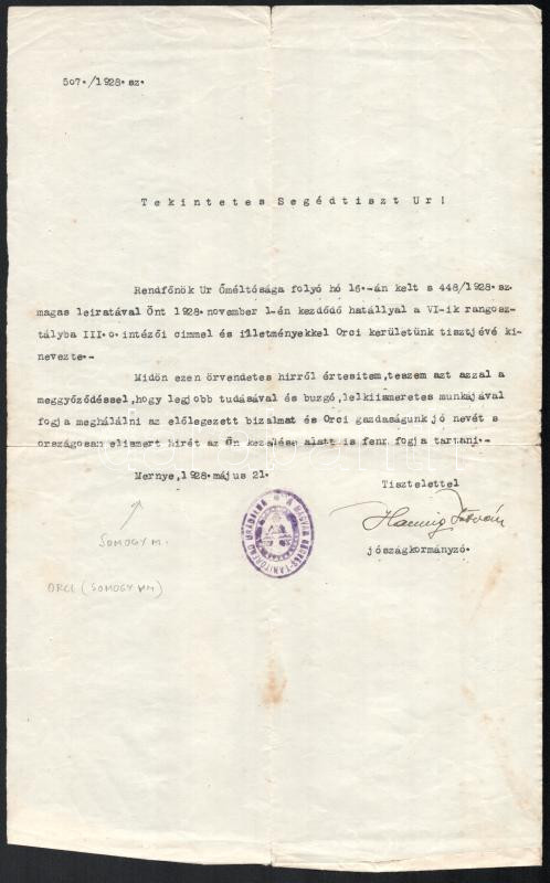 1928 Mernye, kinevezés az Orci kerület tisztjévé, uradalmi pecséttel, ...