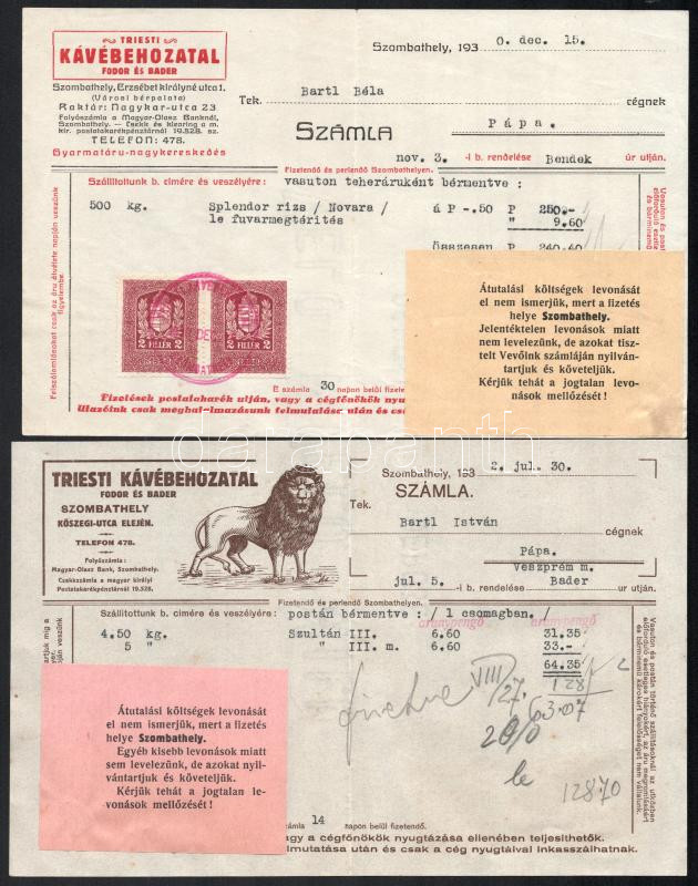 1930, 1932 2db Fodor és Bader Trieszti Kávébehozatal, Szombathely, fejléces számla
