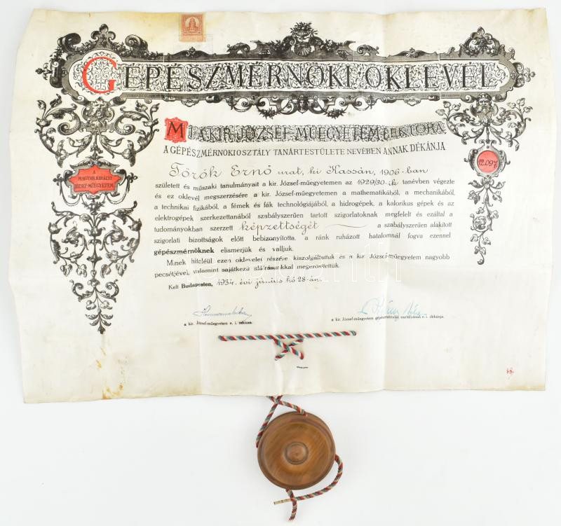 1934 Gépészmérnöki diploma a Budapesti Műszaki Egyetemről. Pergamen, függő viaszpecséttel