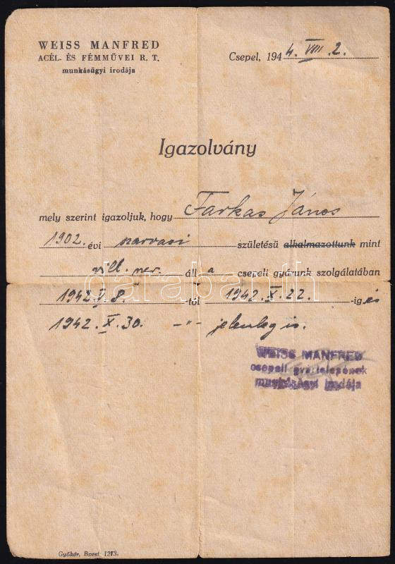 1942 Csepel, Weiss Manfréd Acél- és Fémművei Rt. munkáltatói igazolása...