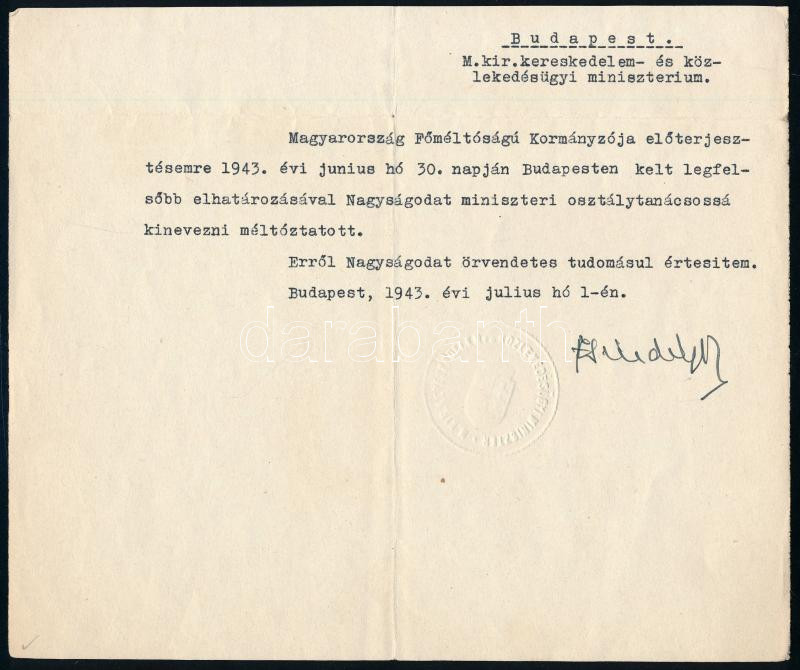 Description: 1943 Bp., Zsindely Ferenc (1891-1963) jogász, író, közlekedés- és kereskedelemügyi miniszter (1943-1944) autográf aláírása miniszteri osztálytanácsosi kinevezésen, szárazpecséttel