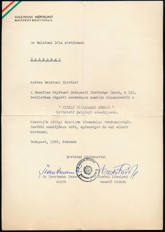 Description: 1949-1983 Vegyes szocialista okmánytétel, szocialista vezetők aláírásaival, 3 db: Trautmann Rezső (1907-1995) építészmérnök, politikus, miniszter, Orbán László (1912-1978) politikus, miniszter, Vass Istvánné Metzker Erzsébet (1915-1980) politikus aláírásaival.