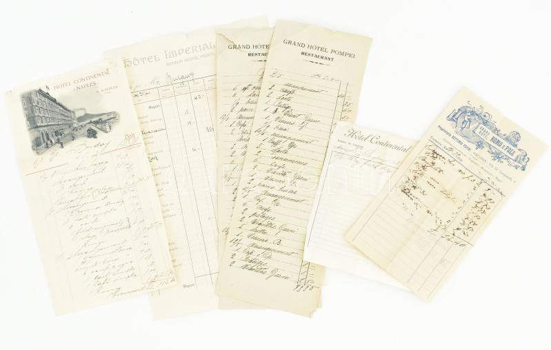 cca 1900-1920 Olasz szállodák, éttermek számlái (Róma, Nápoly, stb.), közte illusztrált fejléces is, össz. 6 db, vegyes állapotban