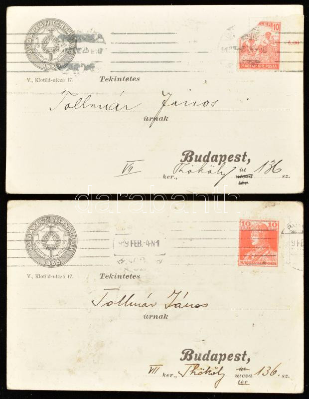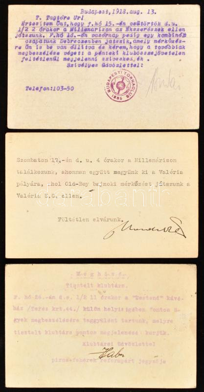 cca 1910-1918 Régi labdarúgó csapatok: Budapesti Torna Club, BSE 5 db meghÃvója játékosok részére mérkÅ‘zésekre az Ékszerészek, a Valéria SC, a Vasas az FTC ellen, a csapatvezetÅ‘k aláÃrásával Tollmár János labdarúgó részére