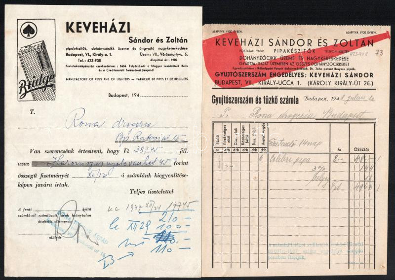 cca 1940 Keveházi Sándor és Zoltán pipakészítők, dohánycikkek üzeme stb. 3 db fejléces számla