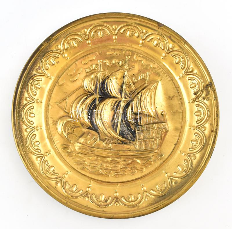 Angol hajós réz fali dísztál, préselt, kopásokkal, d: 25 cm