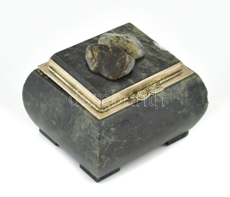 Ékszeres dobozka fém szerelékkel, műkő, kopásokkal, 6,5x5,5x5 cm