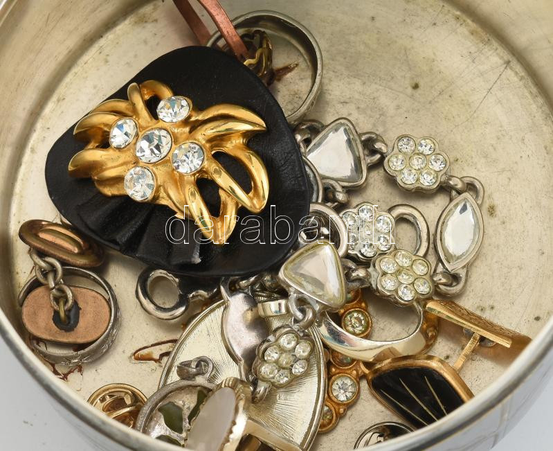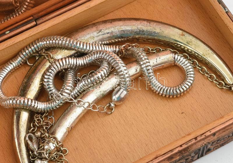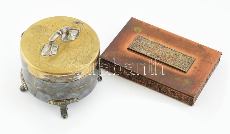 Ezüstözött alpakka háromlábú bonbonier / ékszerdoboz, gilosált mintával dÃszÃtve, fedelén fogantyúval. Jelzett, részben lekopott ezüstözéssel, lábán nem áll stabilan, d: 10 cm + Vörösréz iparművész doboz, cigarettatartó, 14x9,5x2 cm. Bennük vegyes bizsu ékszerek (16 db).