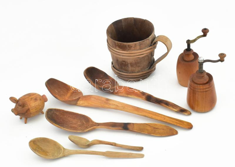 Fa tárgyak: borsdaráló 2 db, kanalak, malac, stb