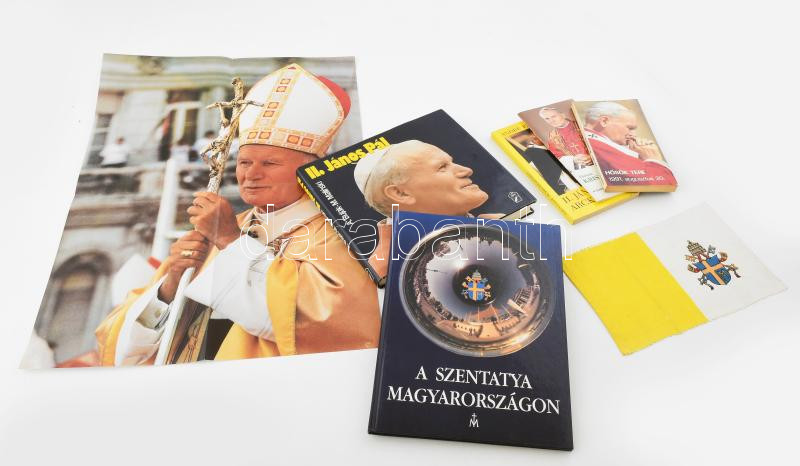 II. János Pál pápával kapcsolatos tétel: 5 db könyv, plakát, vatikáni zászló