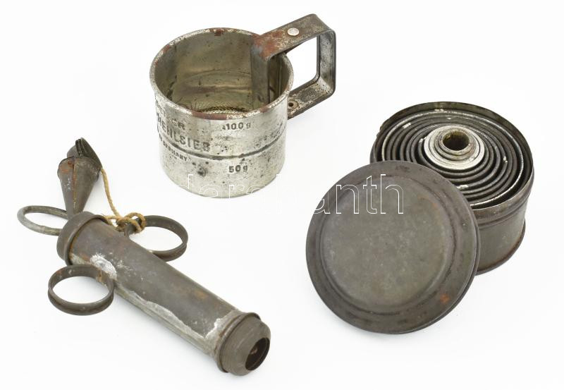 Régi fém konyhai / cukrász eszközök: Dr. Oetker liszt szita, 100 g-os + sokrészes tésztaszaggató szett + tortadíszítő (krém- / tejszínhab nyomó). Kopásokkal, rozsdafoltokkal.