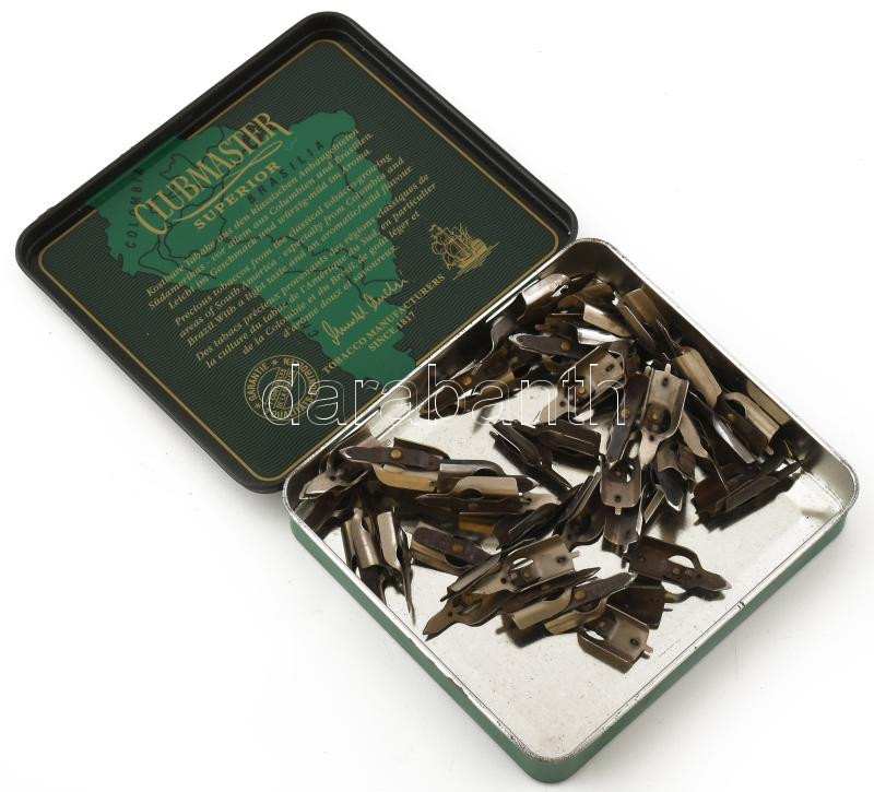 Régi tollhegyek, kb. 50 db, Clubmaster szivarkás fémdobozban, 9x8,5x1,...