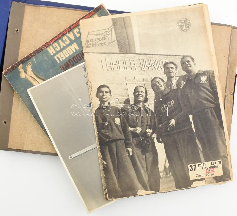 Repülőmodellezés - Fotóalbum, 1951. Lengyelország, Nemzetközi Repülőmodellező Bajnokság - ,,Miedzynarodowe Zawody Modeli Latajacych, Polska, Wrzesien, 1951." Egyedi album, eredeti beragasztott fényképekkel a versenyen résztvevő csapatokról, és a verseny eseményeiről, összesen 68 darab fényképet tartalmaz, lapjai kijárnak. Hozzá tartozik: a versenyről 1953-ban megjelent, lengyel nyelvű nyomtatott kiadvány az album fotóival is illusztrálva; a Skrzydła i Motor folyóirat 1951/37. és 38. száma, amely a versenyről tudósít, valamint a résztvevők közös csapatfényképe. Prov.: Horváth Ernő (1916-2015) világ- Európa- és magyar bajnok repülő és -autómodellező, távolsági világcsúcstartó, a MÁV repülőmodellező klub vezetője hagyatékából.