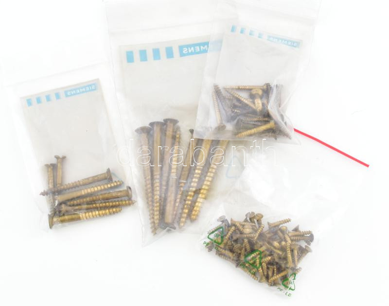 Réz facsavarok, többféle (13 mm, 20 mm, 40 mm, 62 mm), méret szerint válogatva, tasakokban, össz. kb. 100 db