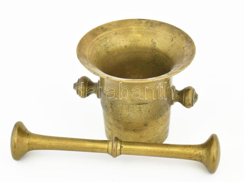 Réz mozsár törővel, m: 12,5 cm, d: 14 cm, h: 25 cm