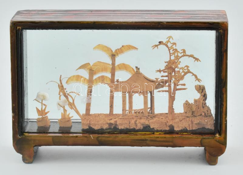 Üvegezett kínai parafakép, kis kopással, jelzés nélkül, 12x8 cm