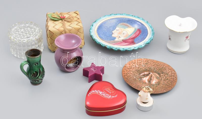 Vegyes bolha tétel: gyertya, kerámia, réz dombormű. üveg dobozka 9 cm