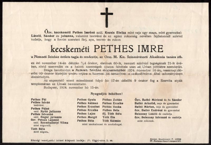 1924 kecskeméti Pethes Imre (1864-1924) színész, színrendező, az Országos M. Kir. Színművészeti Akadémia tanárnak, és a Nemzeti Színház örökös tagjának és rendezőjének halálozási értesítője, hajtott, szakadással.