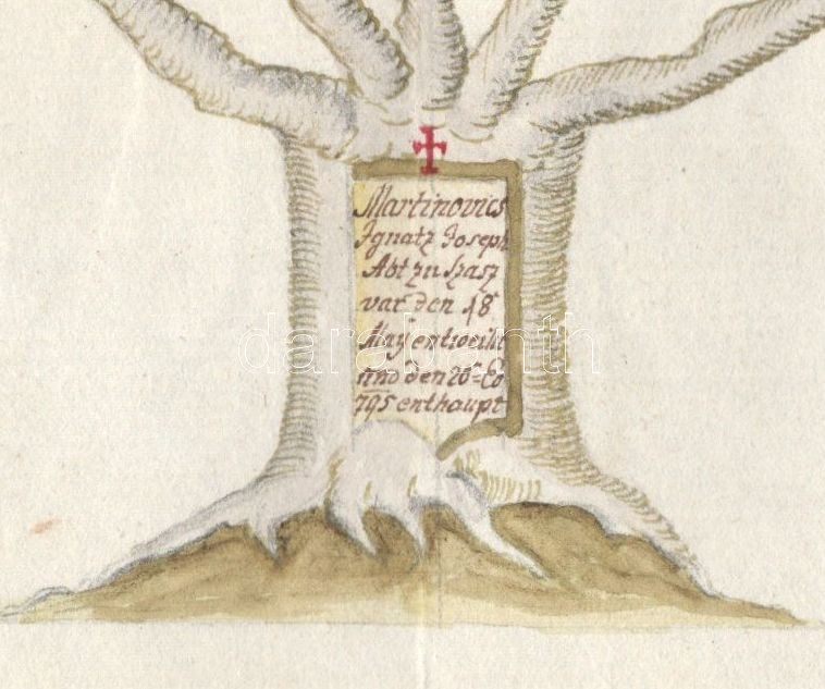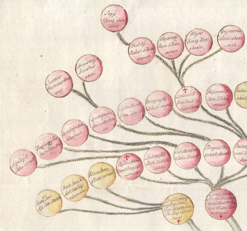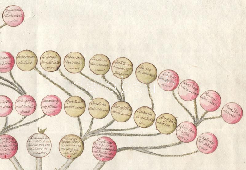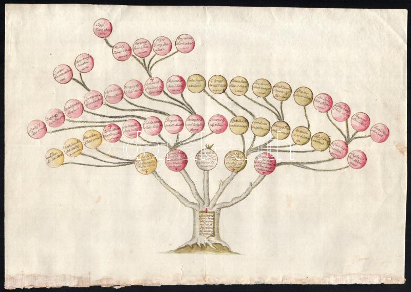 XVIII sz. vége - XIX. sz. eleje: Jakobinus-fa a Martinovics-mozgalom elítéltjeiről. Akvarell-tus, jelzés nélkül, a lap alsó széle kissé sérült, egyik sarka enyhén gyűrődött, néhány apró folttal. Lapméret: 23,5x33,5 cm. Rendkívül ritka!
