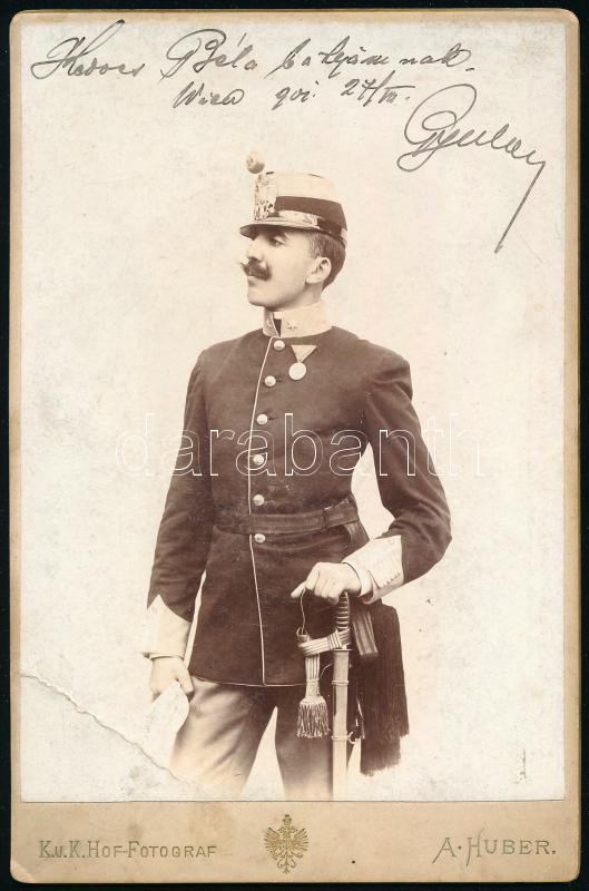 1901 Bécs, kitüntetett magyar katonatiszt (tüzér) dedikált portréja, keményhátú kabinetfotó A. Huber műterméből, felületén törésnyommal, 16,5x10,5 cm