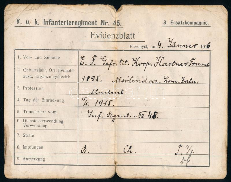 1916 Evidenzblatt, K.u.k. Infanterieregiment Nr. 45. / A cs. és kir. 4... https://www.darabanth.com/en/444-Online-auction/444.0/Art-and-other-collectibles/Military~1500001/1916-Evidenzblatt-Kuk-Infanterieregiment-Nr-45-A-cs-es-kir-45-gyalogezred-altal-kiallC3~II2934156