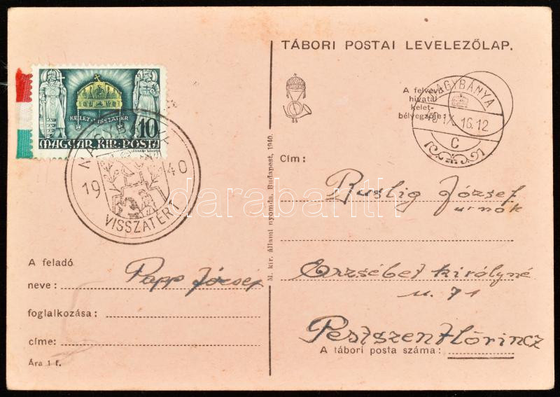 1940 Nagykároly visszatért bélyegzés és trikolor tábori postai levelez...