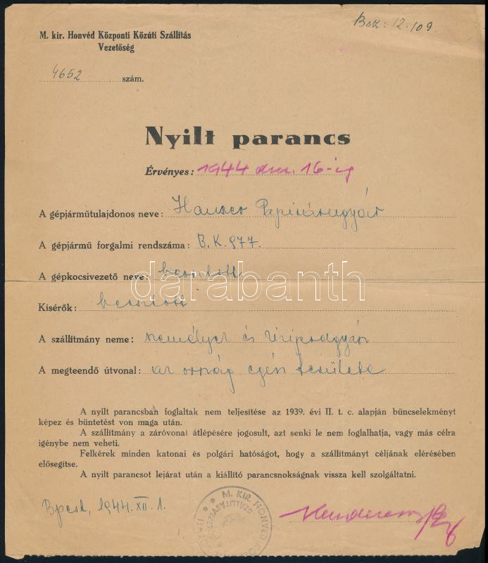 1944 Bp., a M. kir. Honvéd Központi Közúti Szállítás Vezetősége által ... https://www.darabanth.com/en/444-Online-auction/444.0/Art-and-other-collectibles/Military~1500001/1944-Bp-a-M-kir-Honved-Kozponti-Kozuti-Szallitas-Vezetosege-altal-kiadott-nyilt-paran~II2908297