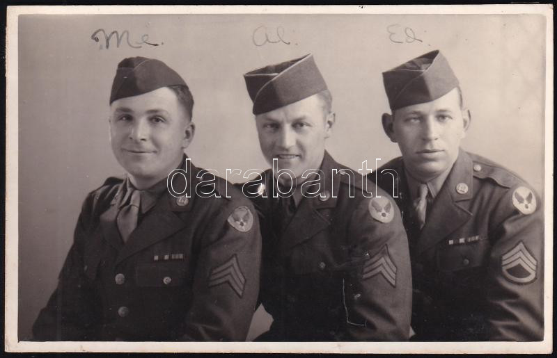 Cca 1947-1947 Fénykép 3 Magyar származású Amerikai Hadi légierő tagjáról, hátoldalán az egyik katona, Tóth Dezső, édesapjától származó leírással.