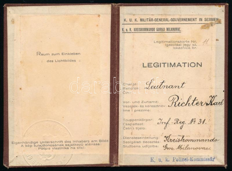 https://www.darabanth.com/en/444-Online-auction/444.0/Art-and-other-collectibles/Military~1500001/cca-1910-1920-Karl-Richter-11-es-szamu-igazolasi-jegye-Kuk-Militar-General-Gouvernement-in-S~II2933232