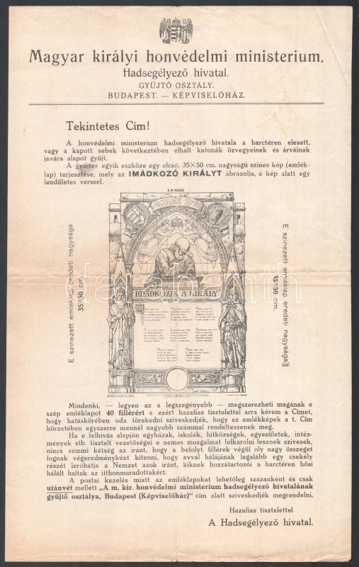 cca 1915 A Magyar Királyi Honvédelmi Minisztérium Hadsegélyező Hivatalának körlevele (az imádkozó Ferenc József színes kép ajánlása)