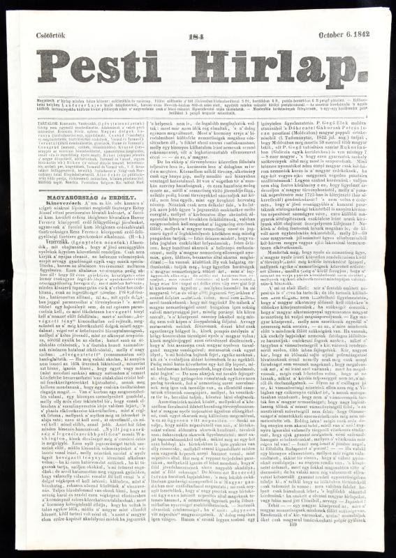 1842 Pesti HÃrlap 184. sz. October 6. 1842. Szerk.: Kossuth Lajos. Pest, Landerer Lajos, javÃtott gerinccel, hajtásnyommal, 705-712 p. Benne korabeli hÃrekkel, érdekes Ãrásokkal, korabeli reklámokkal, gÅ‘zhajómenetrendekkel, gabonaárakkal.