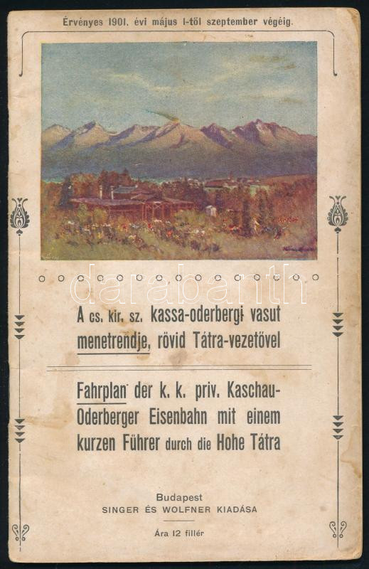 Description: 1901 A cs. kir. sz. kassa-oderbergi vasút menetrendje, rövid Tátra-vezetővel. / Fahrplan der k. k. priv. Kaschau-Oderberger Eisenbahn mit einem kurzen Führer durch die Hohe Tátra. Bp., 1901, Singer és Wolfner, 41+(7) p. Magyar és német nyelven. Kiadói illusztrált, tűzött papírkötés, kissé foltos borítóval.