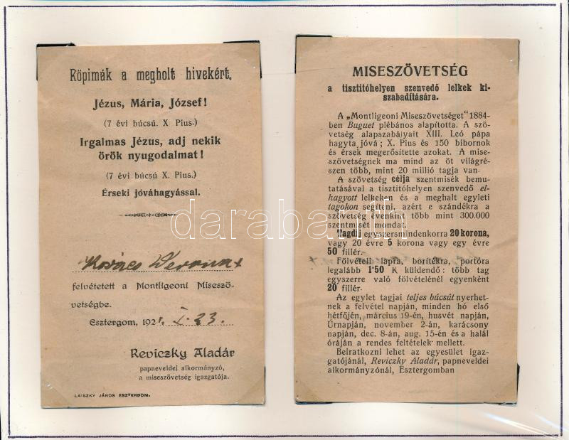 https://www.darabanth.com/en/444-Online-auction/444.0/Art-and-other-collectibles/Printed-Materials~1500007/1921-Esztergom-Montligeoni-Miseszovetseg-imacedula-2-db~II2933206