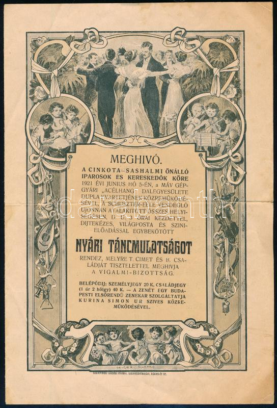 Description: 1921 Meghívó a Cinkota-Sashalmi Önálló Iparosok és Kereskedők Köre által rendezett nyári táncmulatságra, a rendezők névsorával, műsorral. Geiger Richárd grafikájával illusztrálva. Középen hajtott, kis lapszéli szakadásokkal, foltokkal, hátulján ceruzás feljegyzésekkel, 2 sztl. lev.