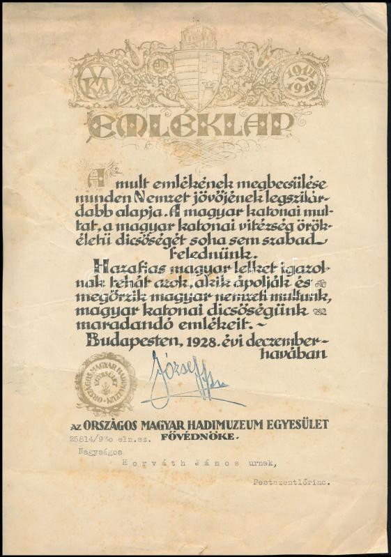 1928 Az Országos Magyar Hadimuzeum Egyesület emléklapja József főherce...