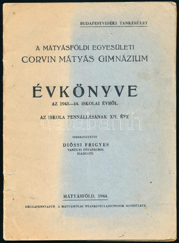 Description: 1935-1944 2 db iskolai értesítő/évkönyv: A Budapesti Evangélikus Gimnázium értesítője az 1934/35. iskolai évről. Sérült fűzéssel, a borítótól elváló lapokkal. + A mátyásföldi egyesületi Corvin Mátyás Gimnázium évkönyve az 1943-44. iskolai évről. Fakó borítóval.