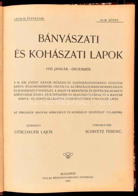 1935 Bányászati és kohászati lapok 1-24. sz., 1935 jan-dec. , LXXIV. évf., 83. kötet.Teljes évfolyam. Szerk.: Litschauer Lajos. Főmunkatárs: Schivetz Ferencz. Bp., Országos Magyar Bányászati és Kohászati Egyesület, XII+464 p.+ 1 (kétoldalas térkép) t. Szövegközti illusztrációkkal. Korabeli reklámokkal. Átkötött félvászon-kötésben.