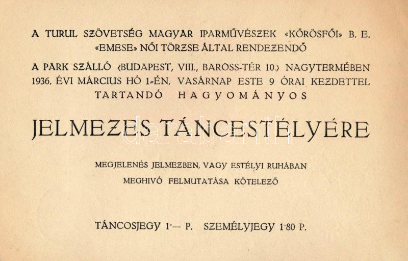 1936 Turul Szövetség jelmezes táncestély meghívó (Gózon Lajos grafikáj...