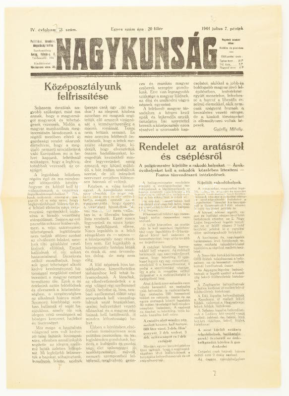 1944 Karcag, a Nagykunság című újság IV. évfolyamának 53. száma