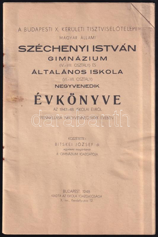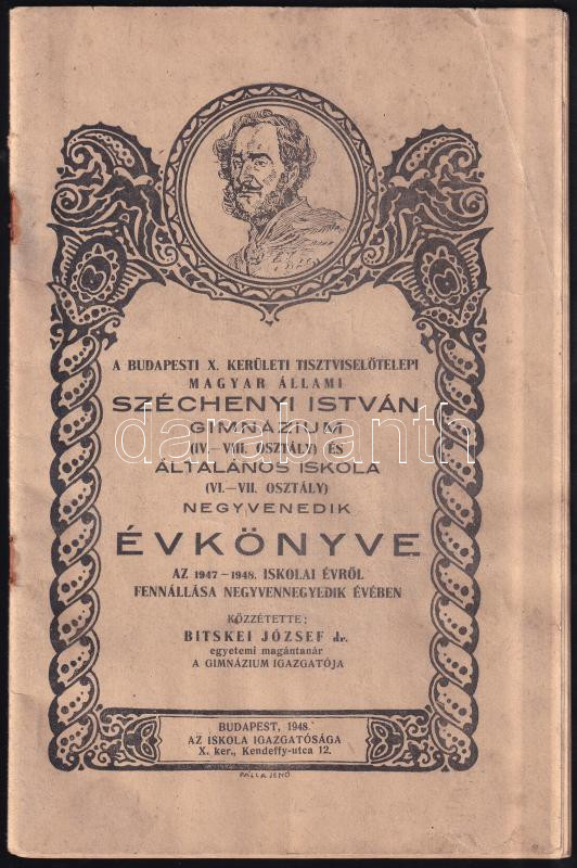 1948 A budapesti X. kerületi Széchenyi István gimnázium és általános i... https://www.darabanth.com/en/444-Online-auction/444.0/Art-and-other-collectibles/Printed-Materials~1500007/1948-A-budapesti-X-keruleti-Szechenyi-Istvan-gimnazium-es-altalanos-iskola-evkonyve-az-194~II2926229