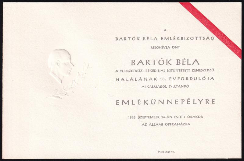 1955 Meghívó Bartók Béla halálának 10. évfordulója alkalmából tartandó emlékünnepélyre, Bartók Béla dombornyomott arcképével, hátoldalán sorszámmal, 14,5x9,5 cm
