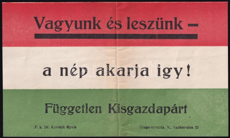 cca 1930-1940 "Vagyunk és leszünk - a nép akarja így!", a Független Kisgazdapárt politikai röplapja, Bp., Grega-ny., 20x12 cm